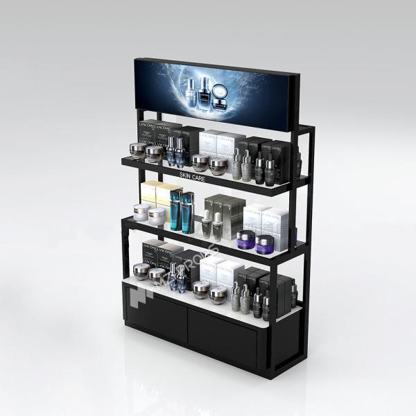 This Cosmetics Display Stand Mainly Adopts A 15 * 30mm Iron Square Tube Structure, Black Glossy Paint, Double-Sided Soft Film Light Box, Creating A Modern And Simple Display Effect.
